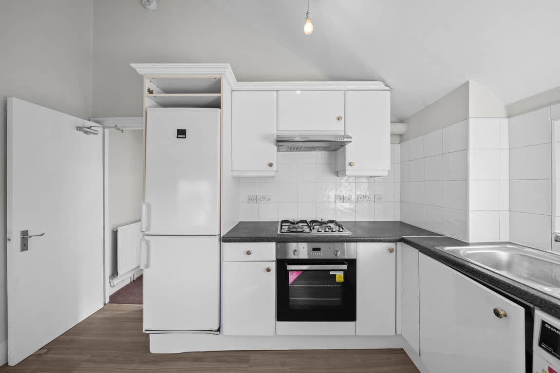 This spacious top-floor flat occupies 785 sq. ft. within a handsome period building on Brondesbury Road. Light and volume define the space, with excellent ceiling height throughout and generously proportioned rooms that are rare to find.