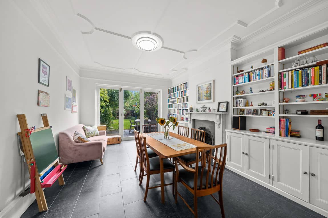 The ground floor centres around a striking 28ft kitchen diner — nearly nine metres in length — opening onto a garden approaching 60ft, creating a remarkable space for family living and entertaining. At the front, a bay-fronted reception room showcases fireplaces, decorative cornicing, and ceiling mouldings, while a separate study and a wine cellar provide further versatility.