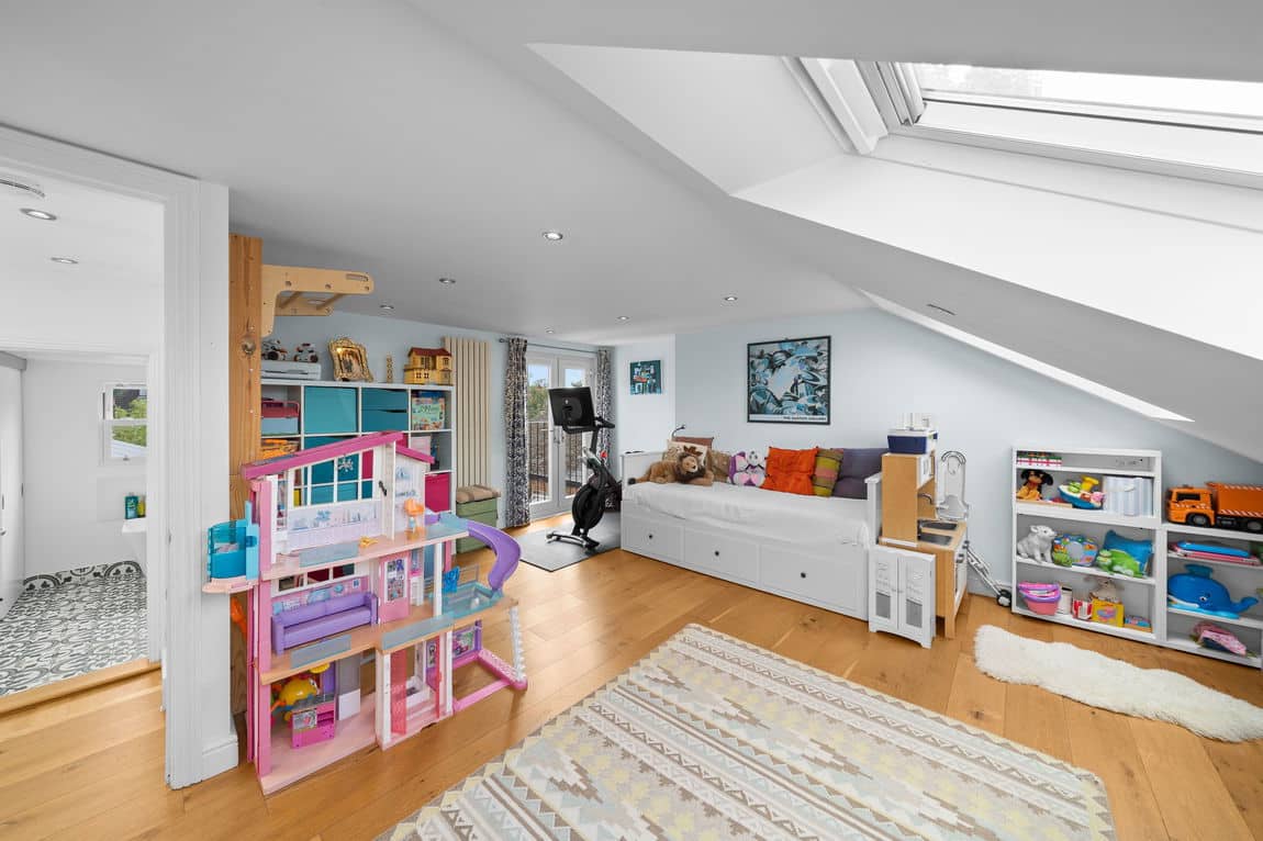Upstairs, four double bedrooms are arranged across the upper levels, including a loft conversion, complemented by two family bathrooms.
