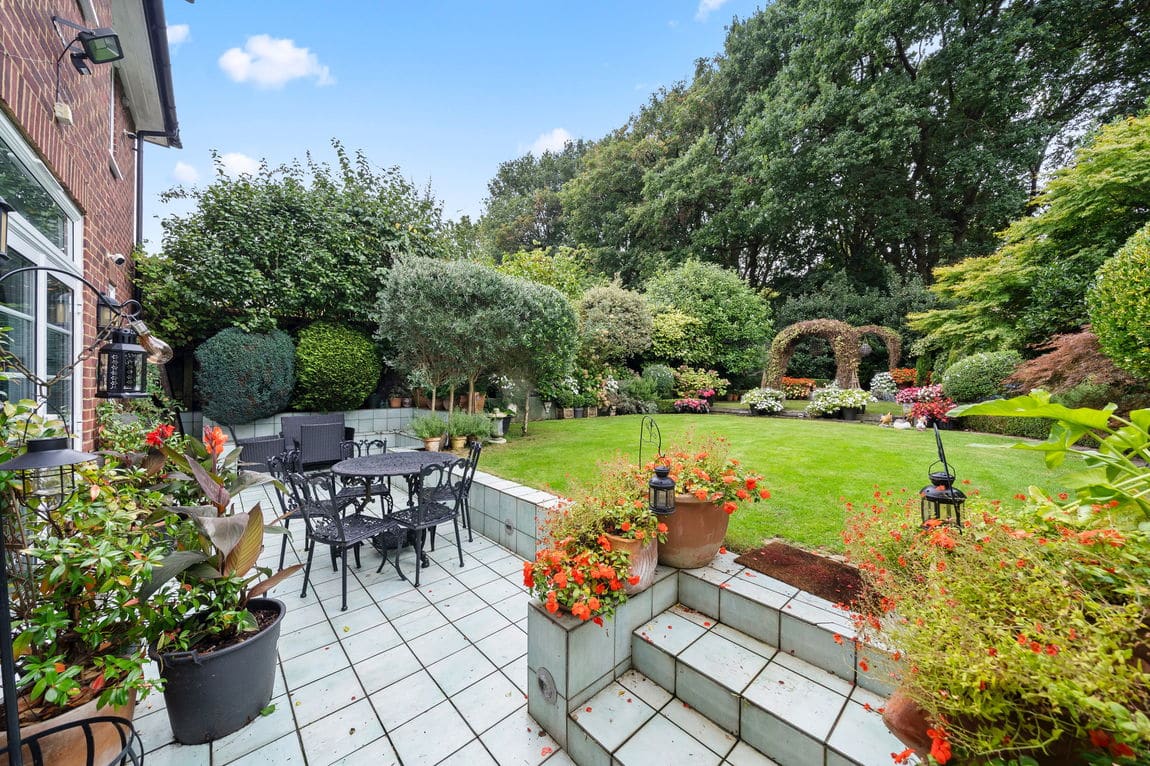 The first floor is home to three generous bedrooms, each with its own en suite bathroom. The principal bedroom enjoys a peaceful outlook across the garden and features bespoke fitted storage.