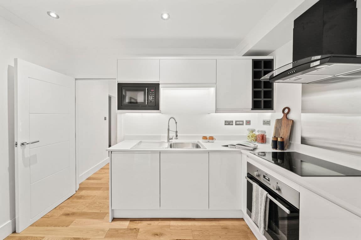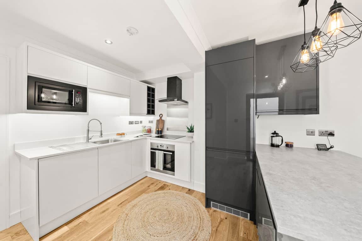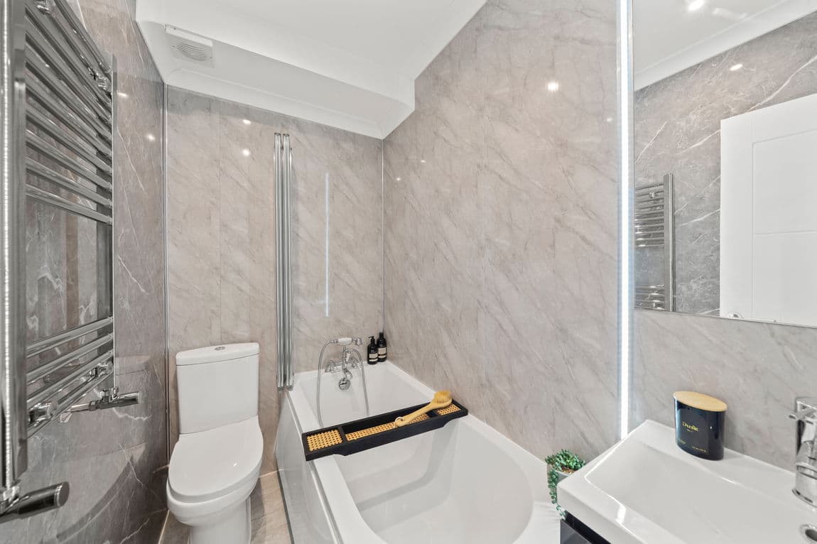 There are two generous bedrooms, including a principal bedroom with en suite bathroom, along with a further modern bathroom. The flat is immaculately maintained and ready for immediate occupation.