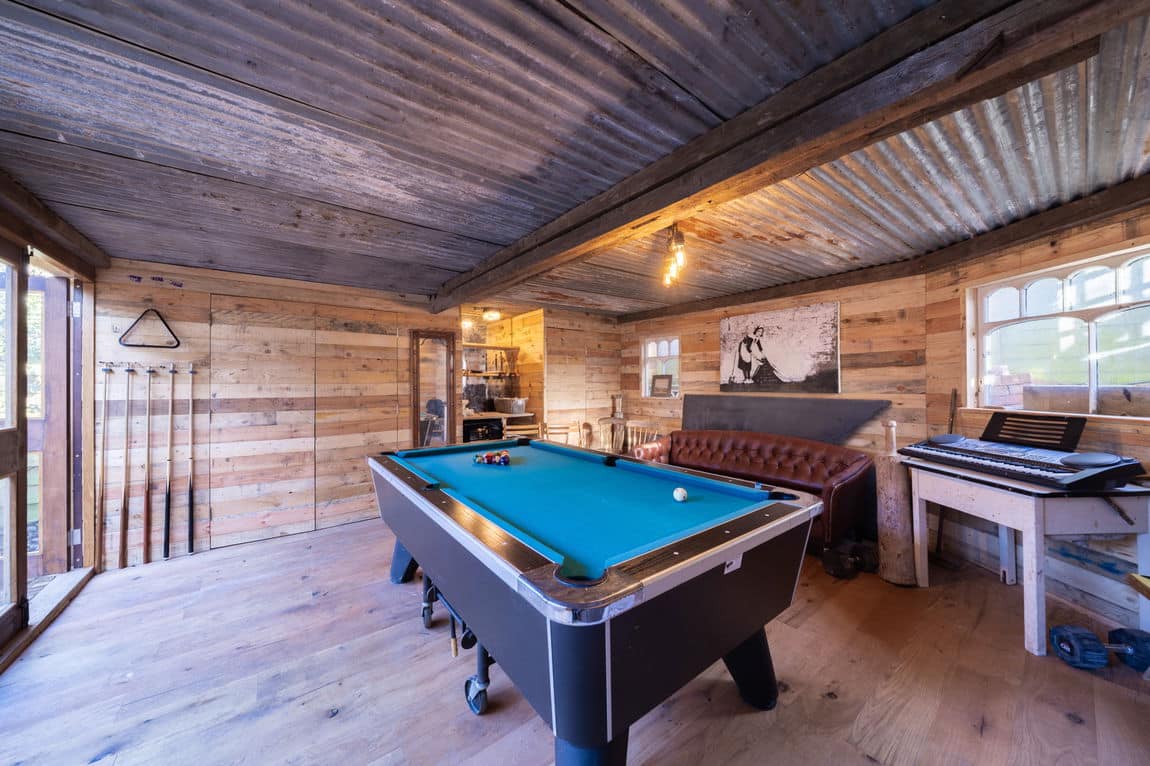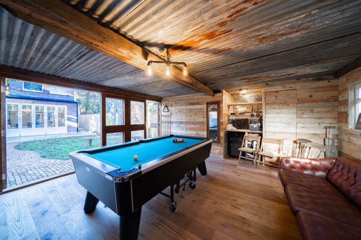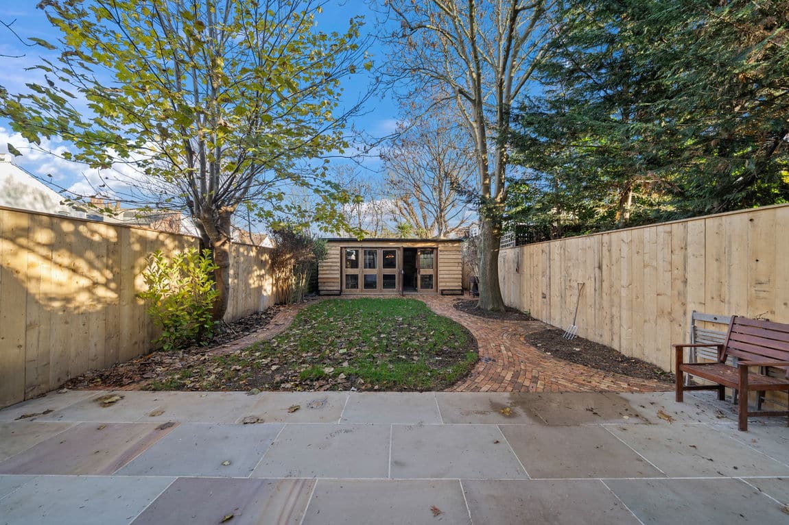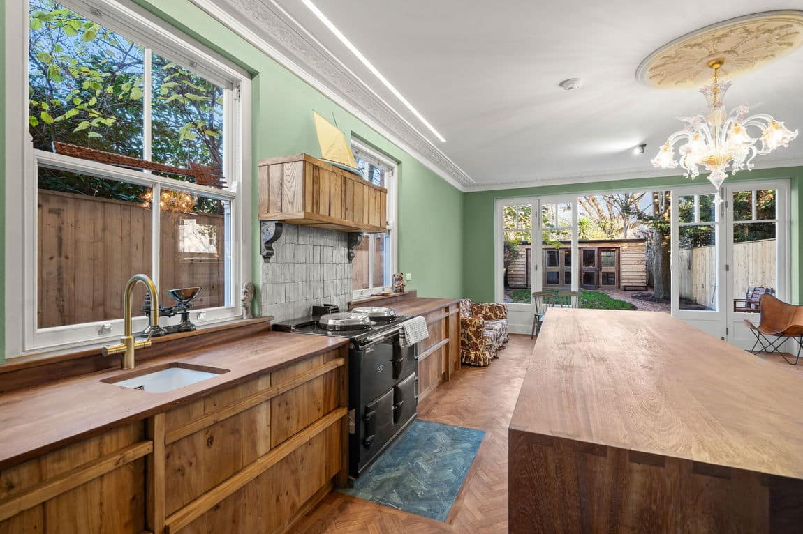 The heart of the home is the open plan kitchen and living space, handmade from reclaimed English Elm with Iroko worktops and an Aga. A Deffra approved wood burner anchors the seating area and Murano chandeliers bring a soft glow. Hardwood framed bifolding doors open to an Indian sandstone terrace and landscaped garden, leading to a fully fitted summer house with bar and facilities, ideal as a gym, studio or office.