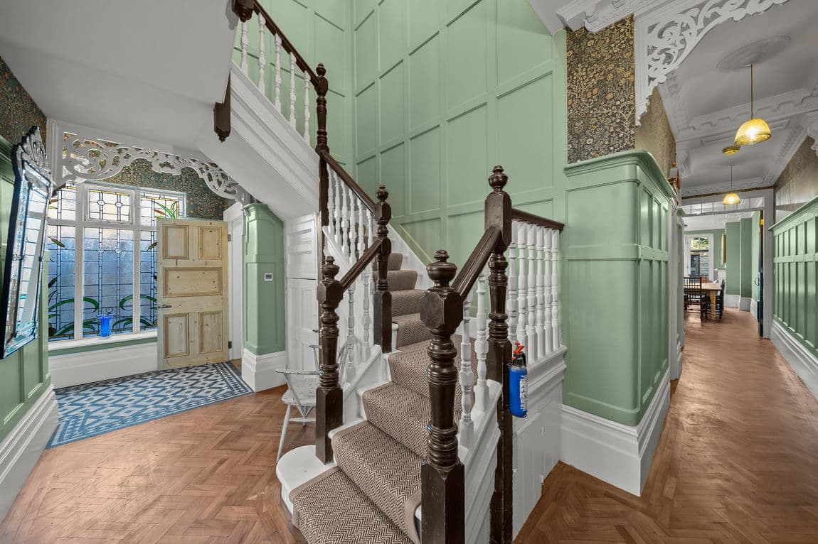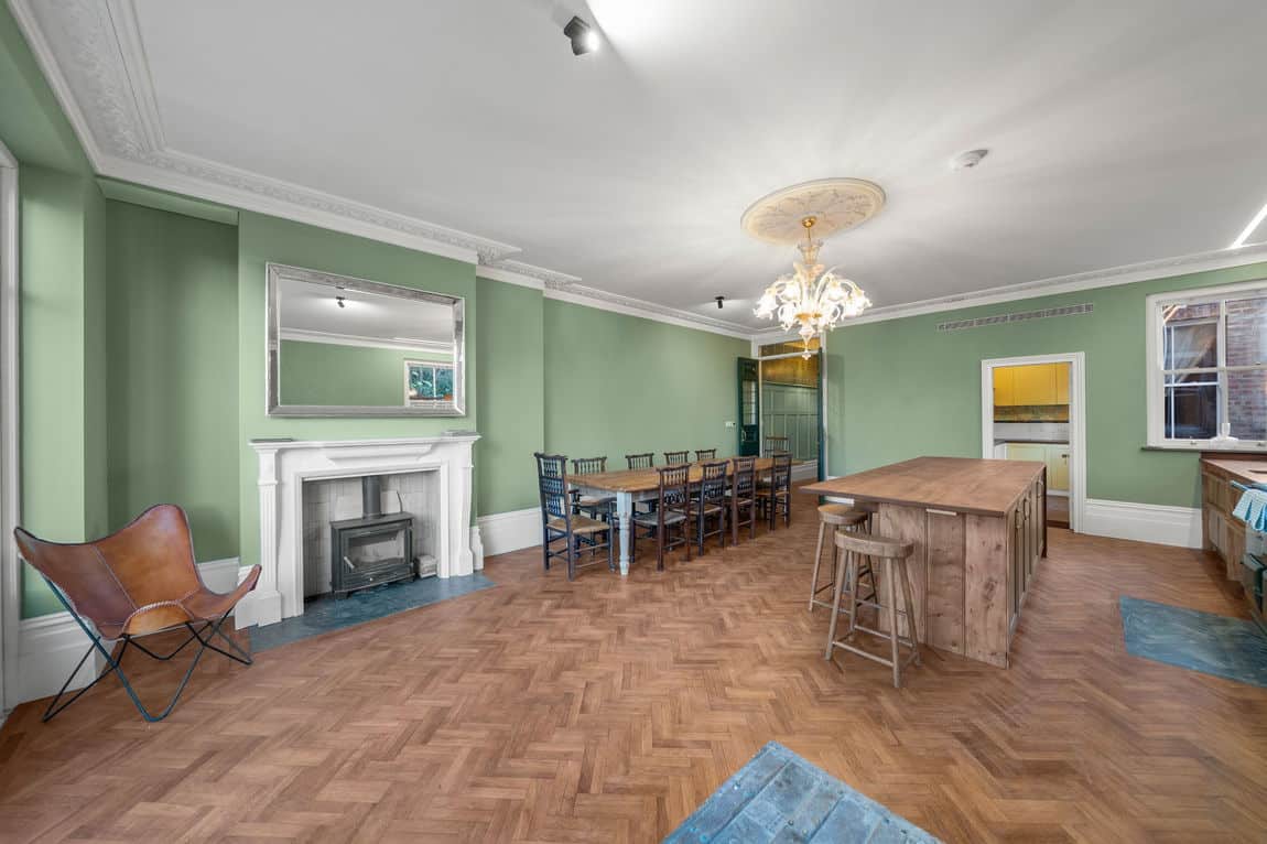 A reclaimed brick basket weave driveway leads to an elegant façade with double glazed timber sash windows. Inside, the entrance hall sets an Edwardian tone with high skirting boards, panelling, ornate cornicing, stained glass and original pediments. Reclaimed parquet flooring runs across the ground floor, linking the formal receptions, cigar room with leather flooring, cloakroom, laundry room and a highly practical dirty kitchen.