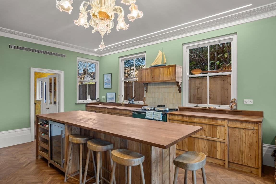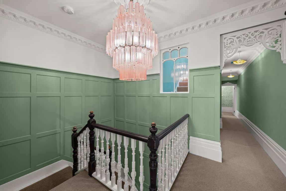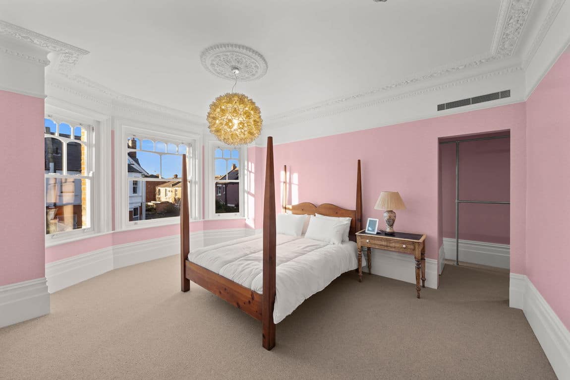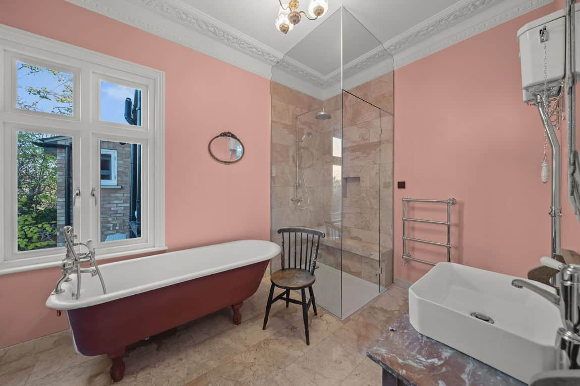 Upstairs, the principal suite features high skirtings, intricate cornicing, a secret walk through wardrobe and a luxurious ensuite with original fireplace, roll top bath, reclaimed Victorian washstand, steam shower and Fired Earth pink rose marble. Two further double ensuites sit along the hallway, while the rear suite enjoys vaulted ceilings and leafy views.