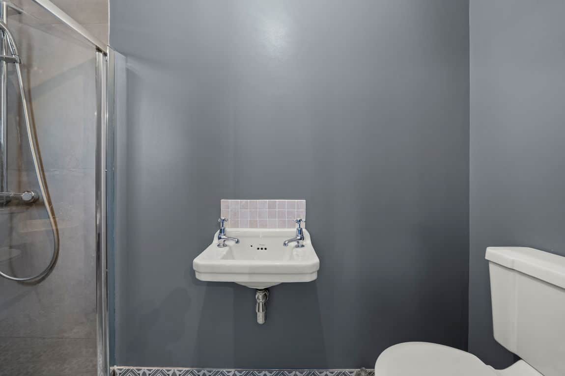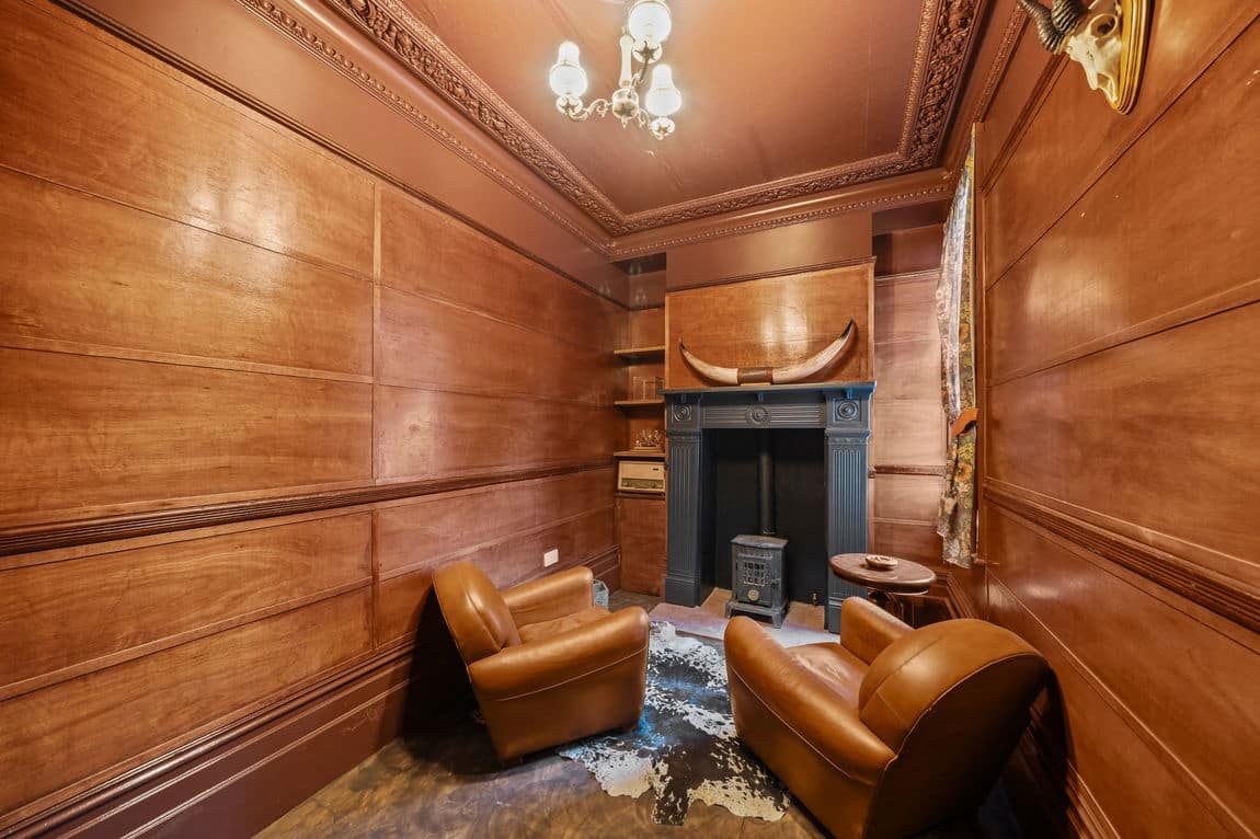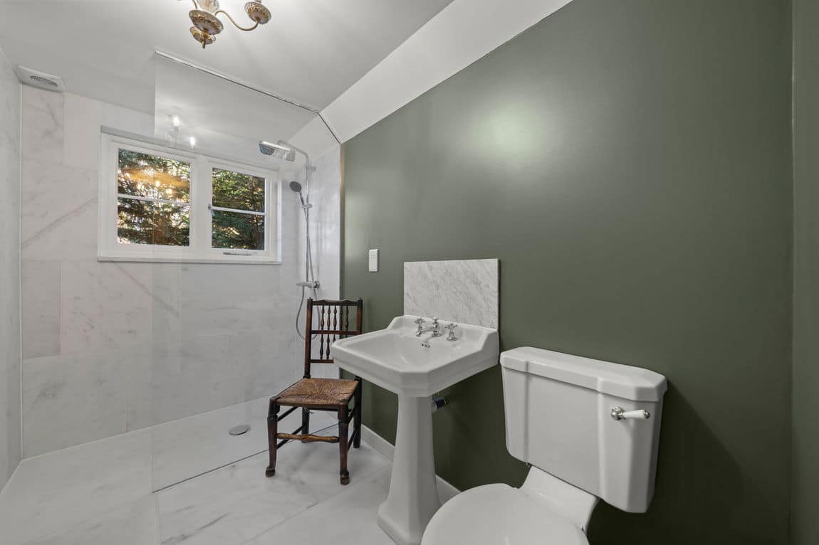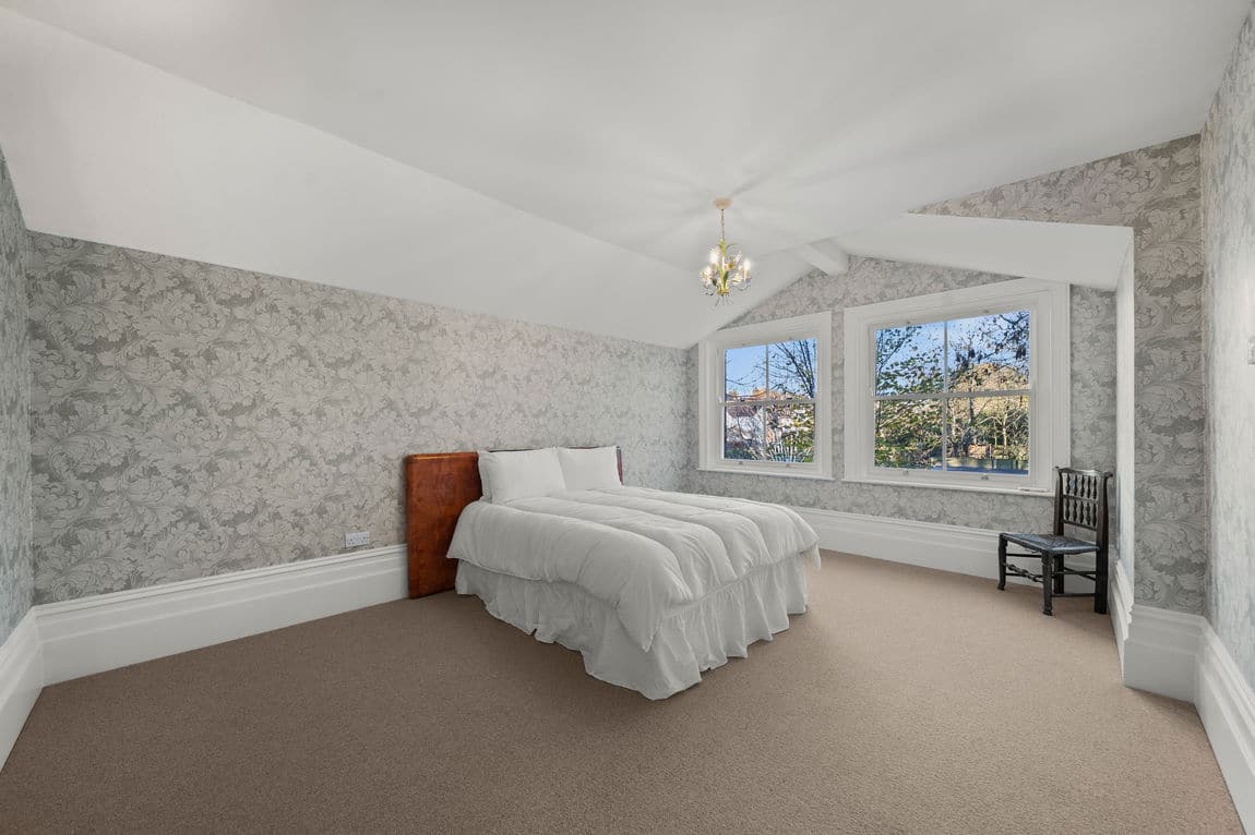 Upstairs, the principal suite features high skirtings, intricate cornicing, a secret walk through wardrobe and a luxurious ensuite with original fireplace, roll top bath, reclaimed Victorian washstand, steam shower and Fired Earth pink rose marble. Two further double ensuites sit along the hallway, while the rear suite enjoys vaulted ceilings and leafy views.