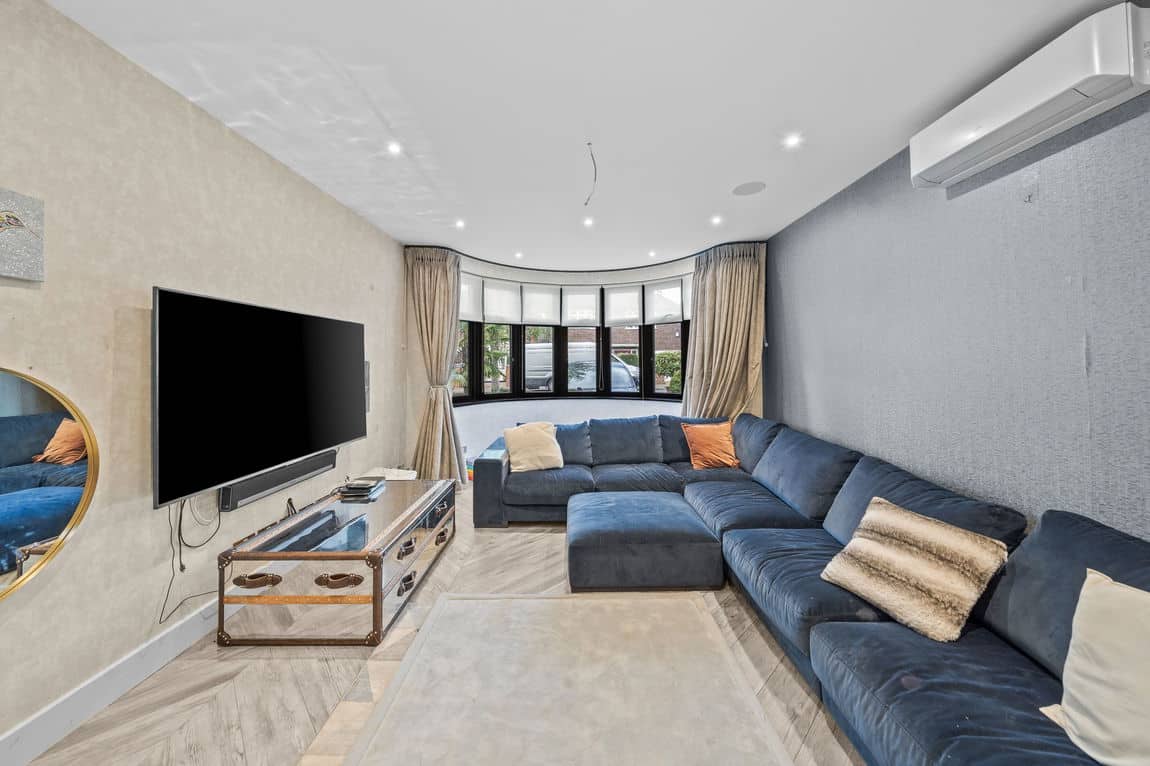 A wide entrance hall sets the tone, giving access to a formal reception on one side and a study or snug on the other. The centrepiece is a spectacular 32 ft family room, designed for both everyday living and entertaining, with sliding doors opening directly onto the south-facing garden. A large walk-in utility room adds further practicality, while the front driveway comfortably accommodates several cars.