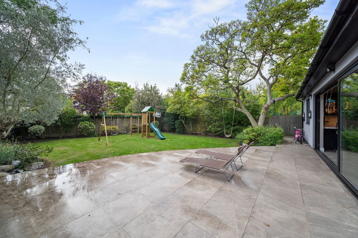 The rear garden combines a broad terrace, ideal for summer gatherings, with a 42 ft lawn framed by mature planting and blossom trees. To the front, the sweeping drive enhances the sense of arrival, providing parking for up to five vehicles.