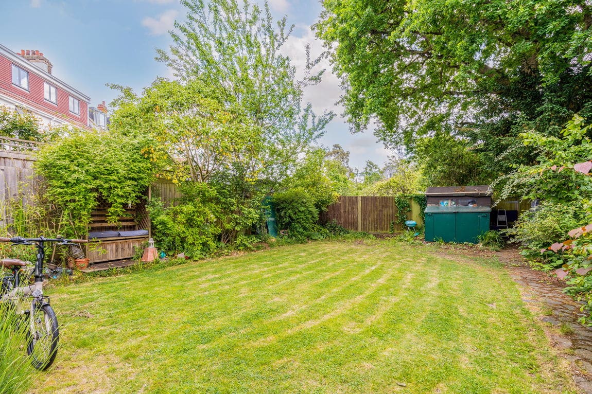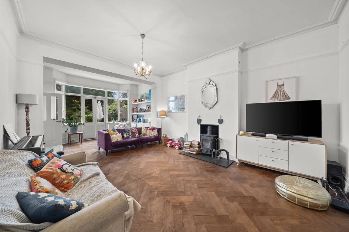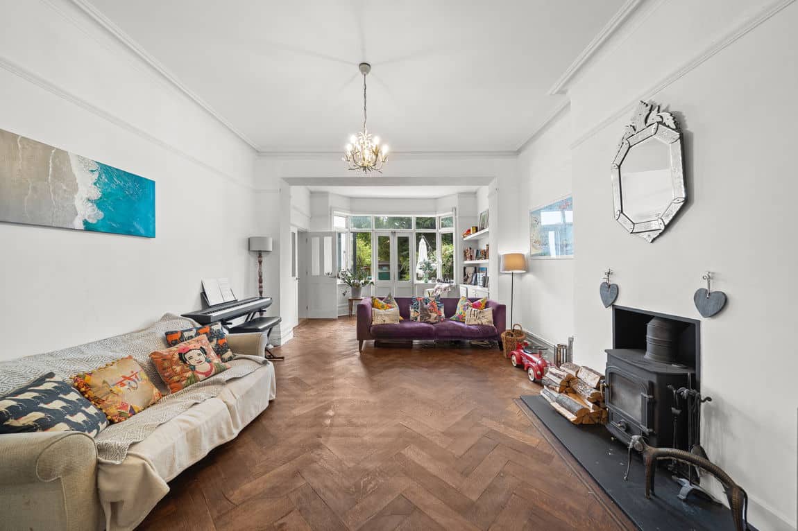 Occupying the ground floor, the property offers 1,134 sq ft of internal space and a private rear garden, combining generous room sizes with smart, practical layout. The front-facing 25 ft reception room features high ceilings and French doors, drawing in plenty of natural light. At the rear, a modern kitchen/diner with integrated appliances opens through bi-folding doors onto a well-maintained garden with a decked seating area and lawn.