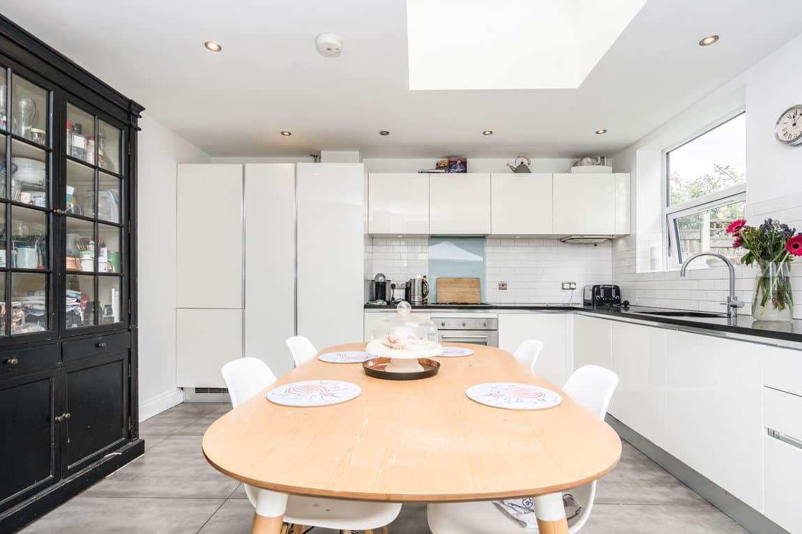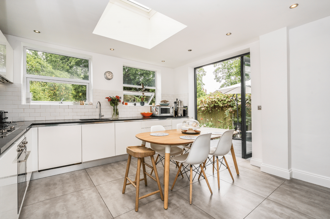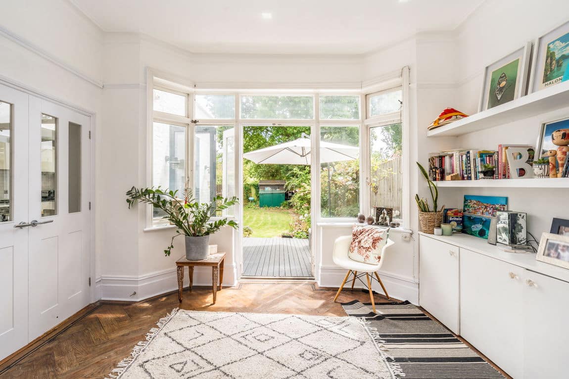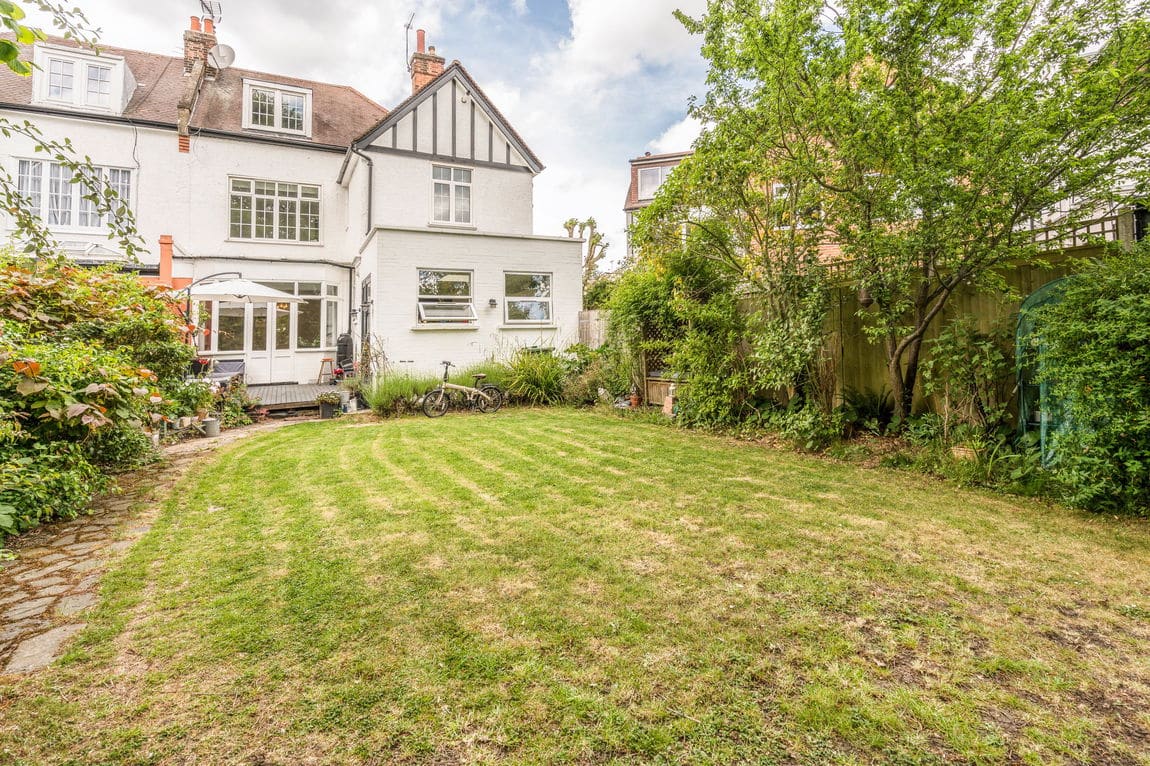 Occupying the ground floor, the property offers 1,134 sq ft of internal space and a private rear garden, combining generous room sizes with smart, practical layout. The front-facing 25 ft reception room features high ceilings and French doors, drawing in plenty of natural light. At the rear, a modern kitchen/diner with integrated appliances opens through bi-folding doors onto a well-maintained garden with a decked seating area and lawn.