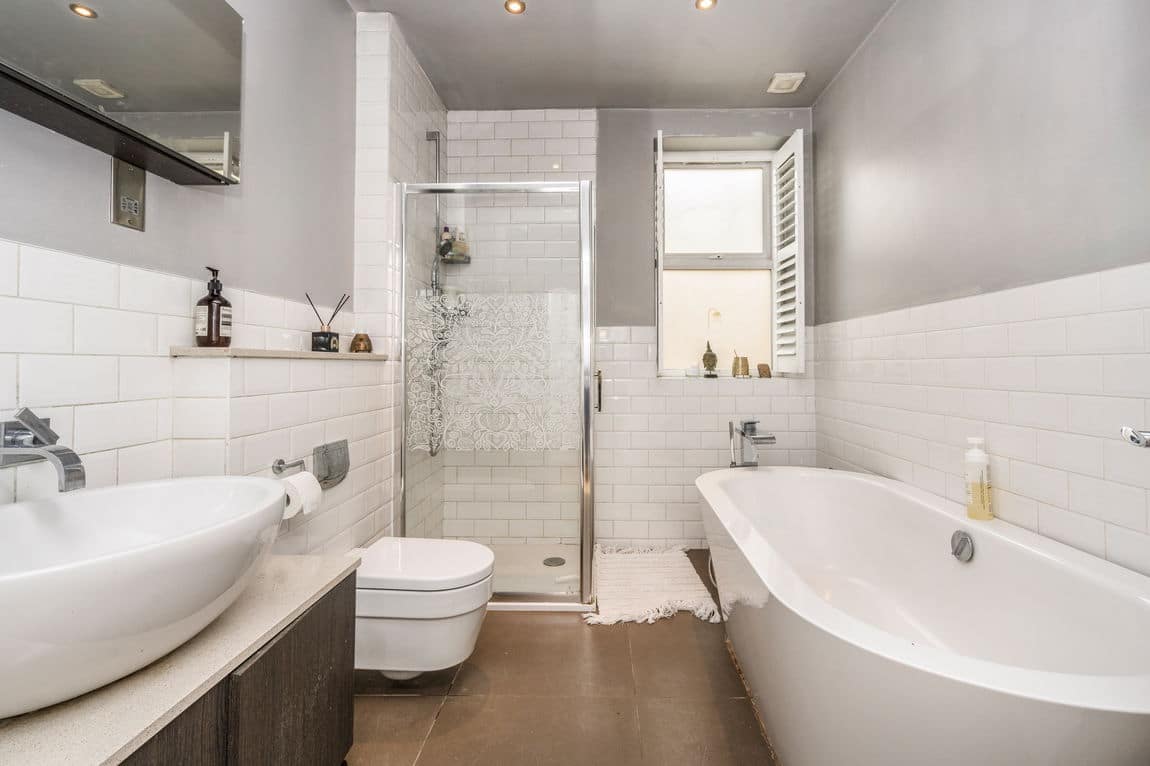There are three double bedrooms, two with fitted wardrobes, and a well-designed family bathroom complete with freestanding bath, metro tiling, and a walk-in shower.