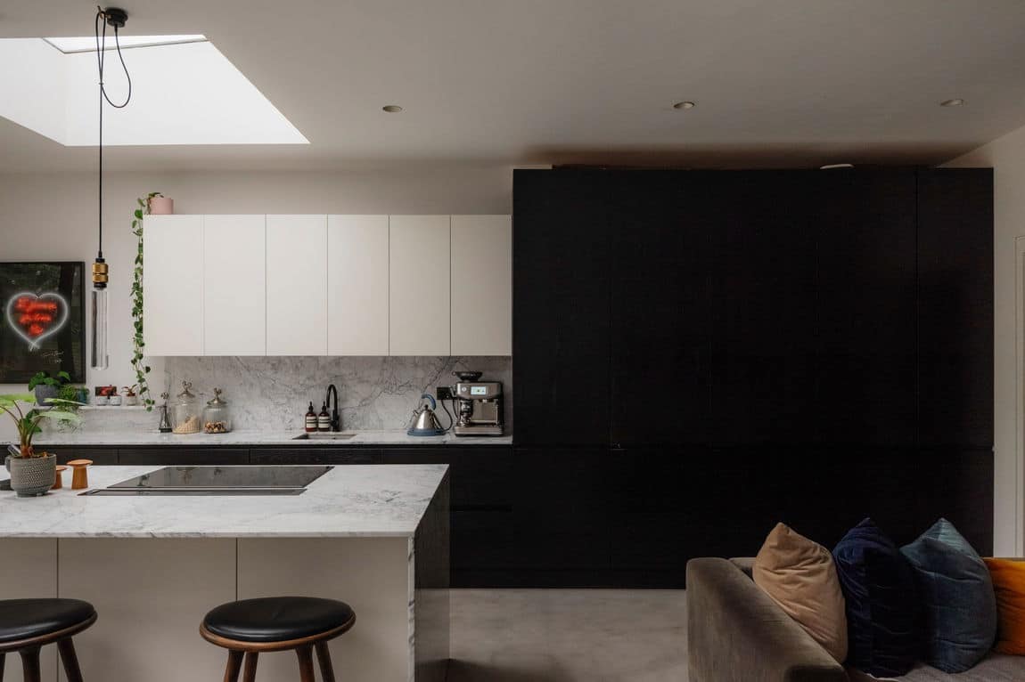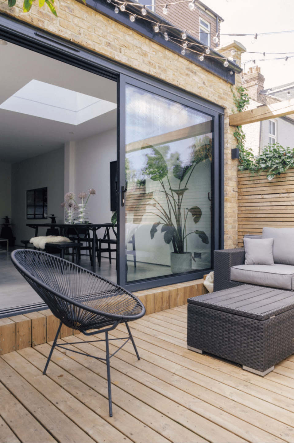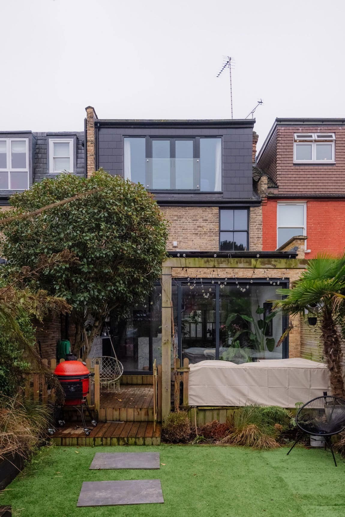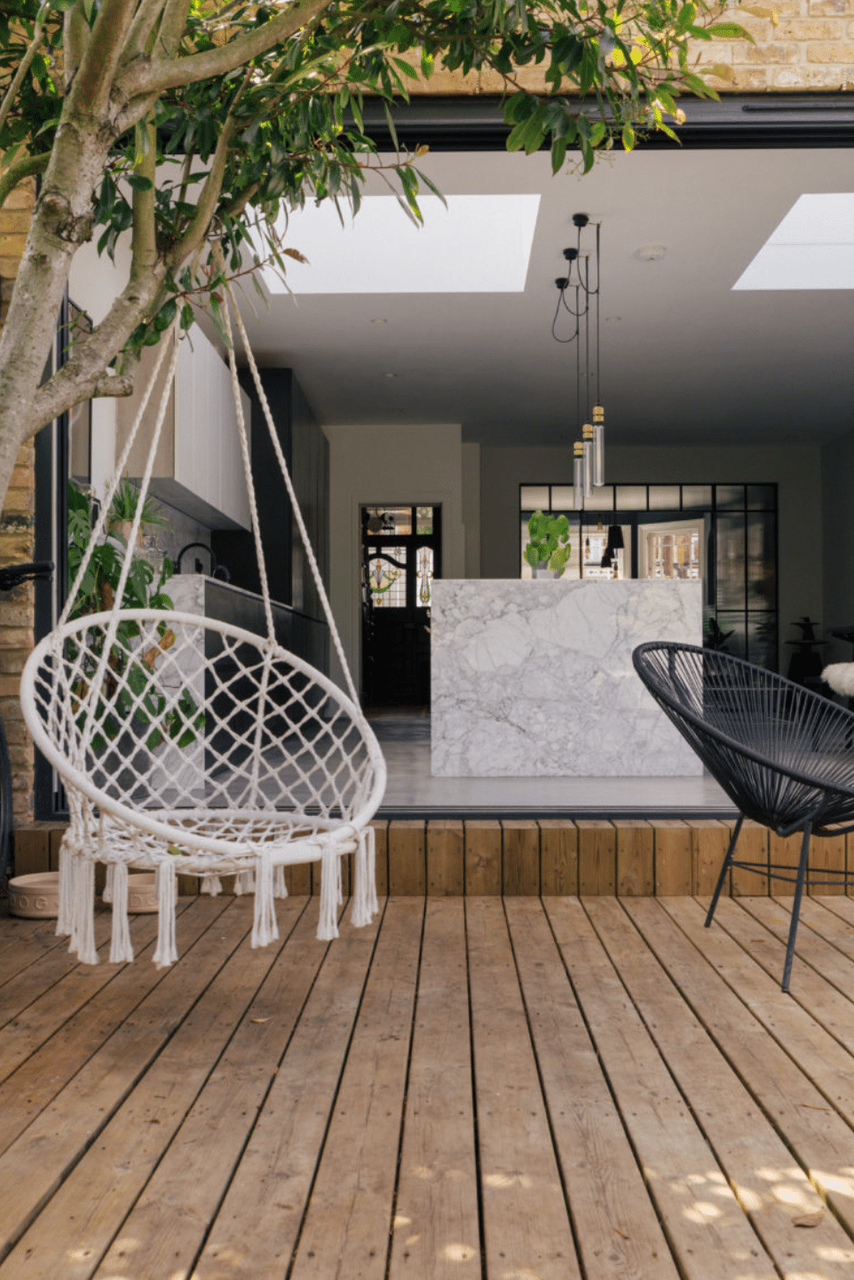 To the rear, a 4.5 metre extension creates an impressive open plan room stretching to over 8 metres in length. Polished concrete floors, marble worktops and a beautifully executed kitchen sit beneath oversized skylights and full height sliding glass doors. Notably, the ceiling height has been preserved throughout, a rare detail that elevates the entire space. The doors lead out to a smart decked terrace for dining and entertaining, followed by a manicured artificial lawn with a far more refined, landscaped finish than traditional AstroTurf.