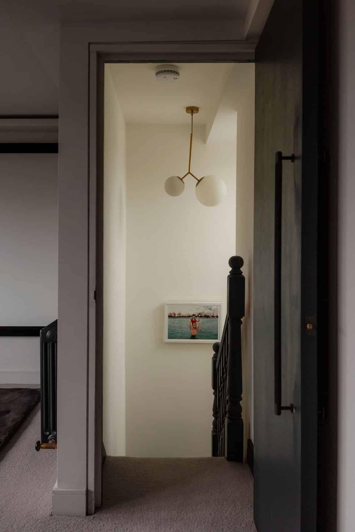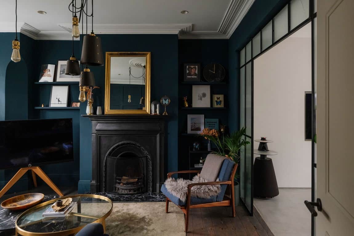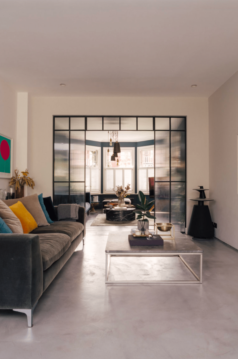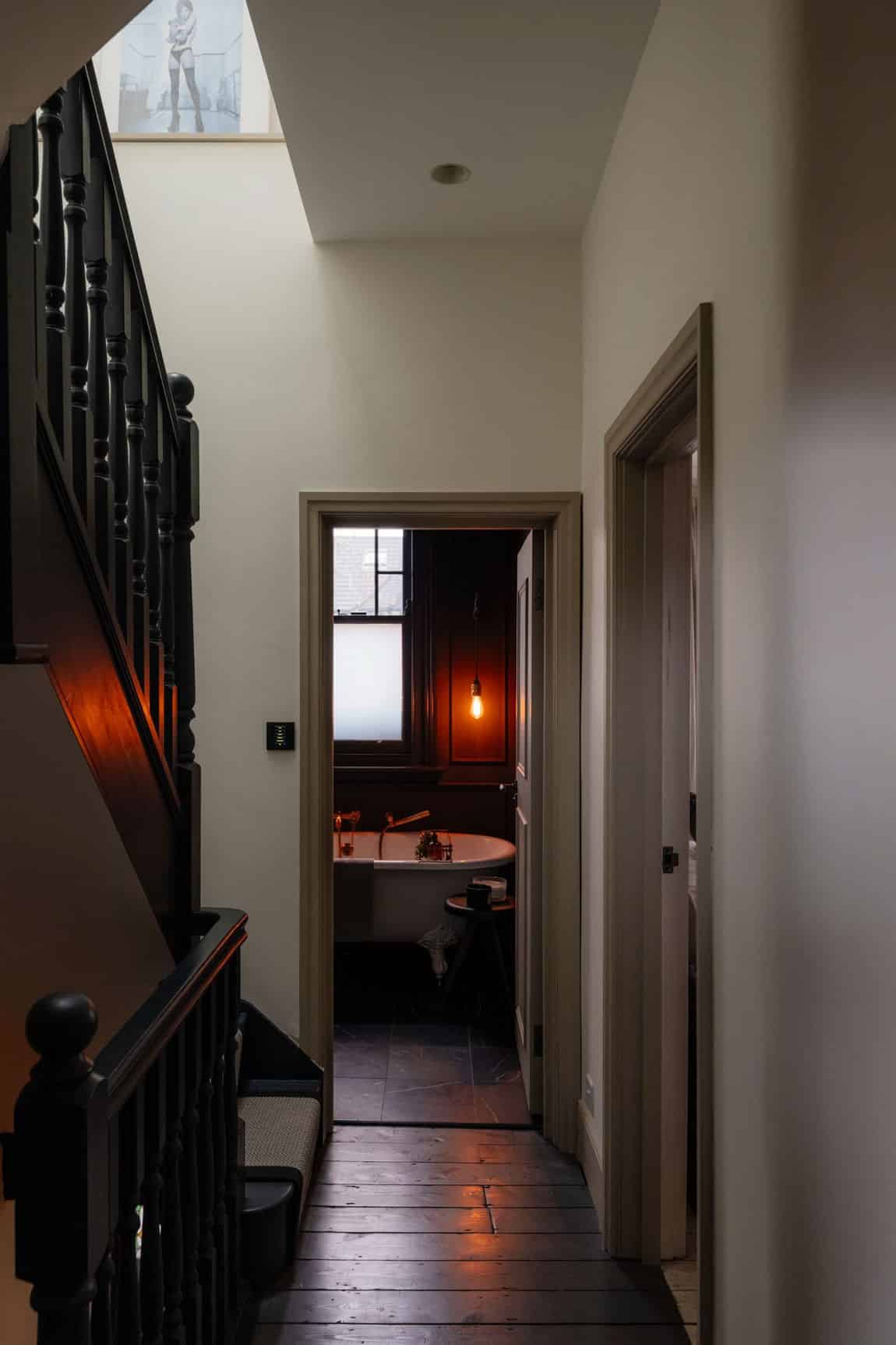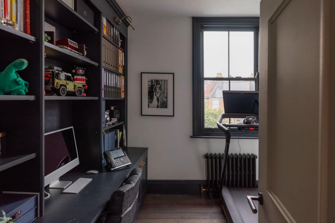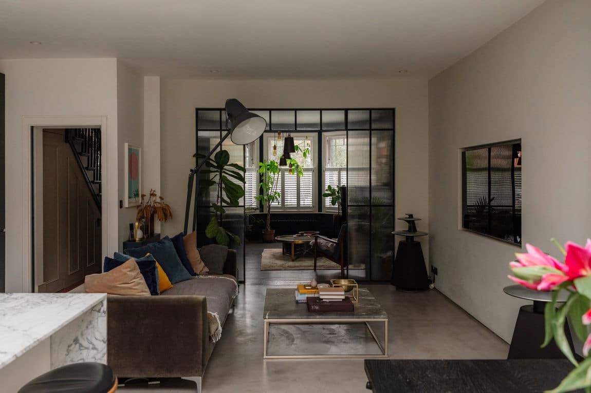 The front reception is rich and atmospheric, finished with reworked original style cornicing, an iron cast fireplace, timber flooring and Victorian style radiators. A bespoke Crittall style fluted glass door replaces the dividing wall, allowing light to flow through while retaining a sense of separation.