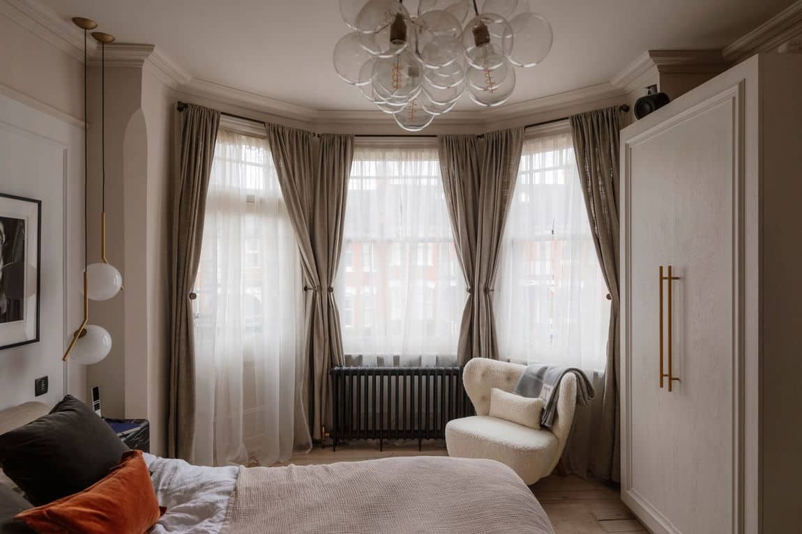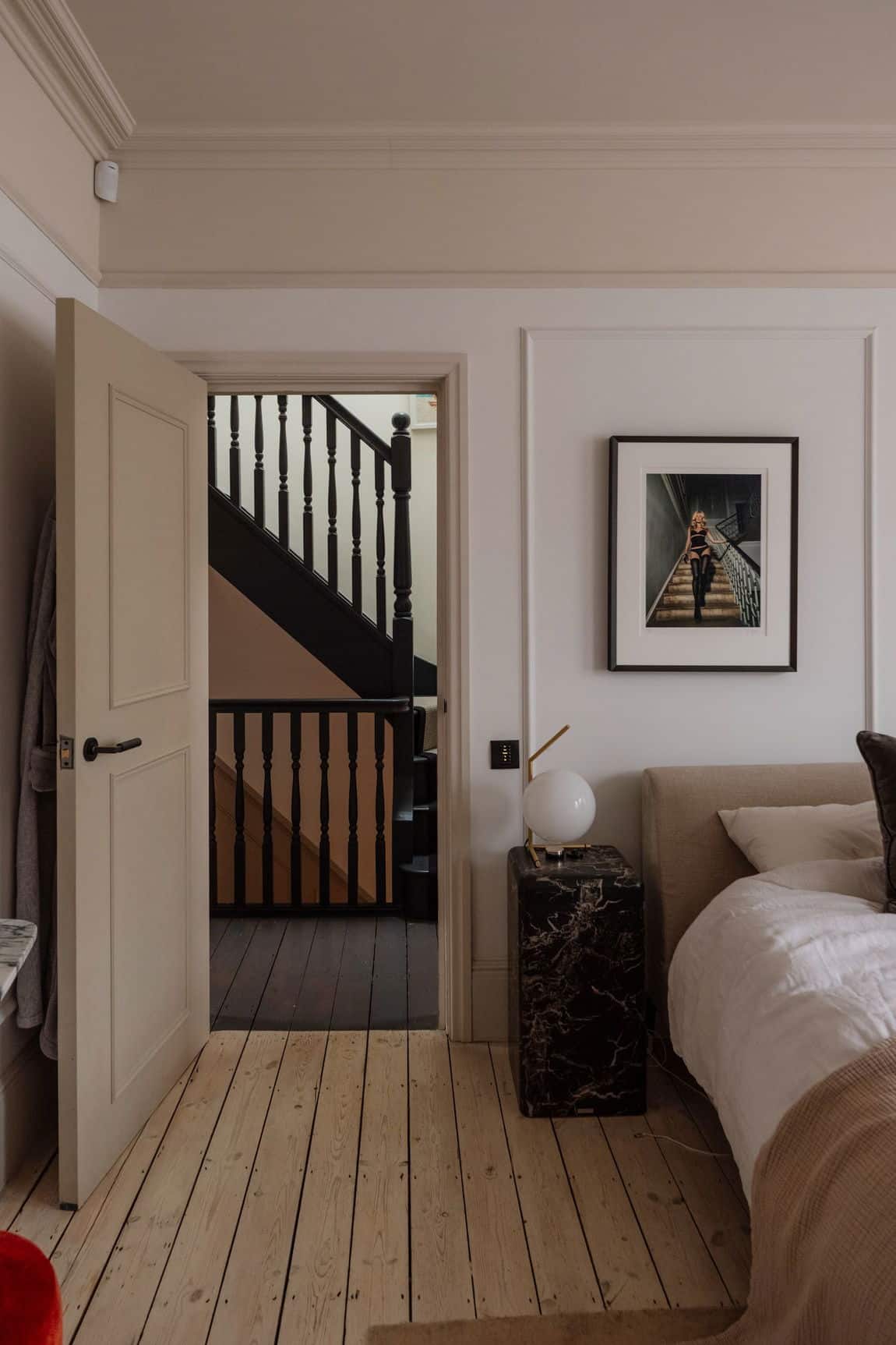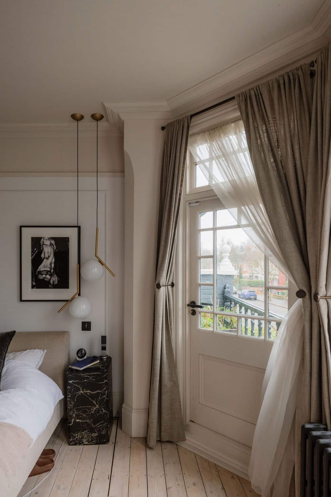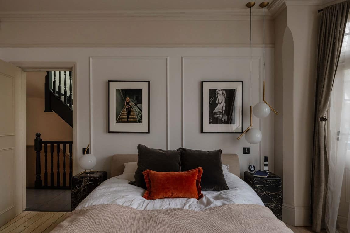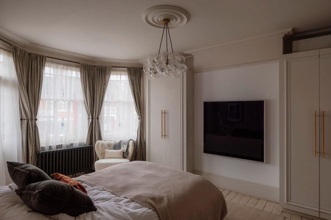 The front reception is rich and atmospheric, finished with reworked original style cornicing, an iron cast fireplace, timber flooring and Victorian style radiators. A bespoke Crittall style fluted glass door replaces the dividing wall, allowing light to flow through while retaining a sense of separation.