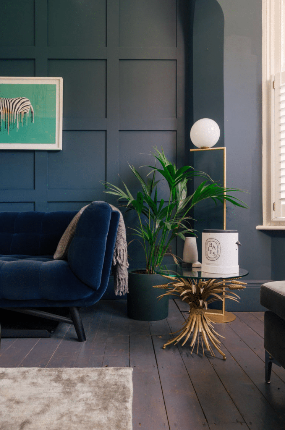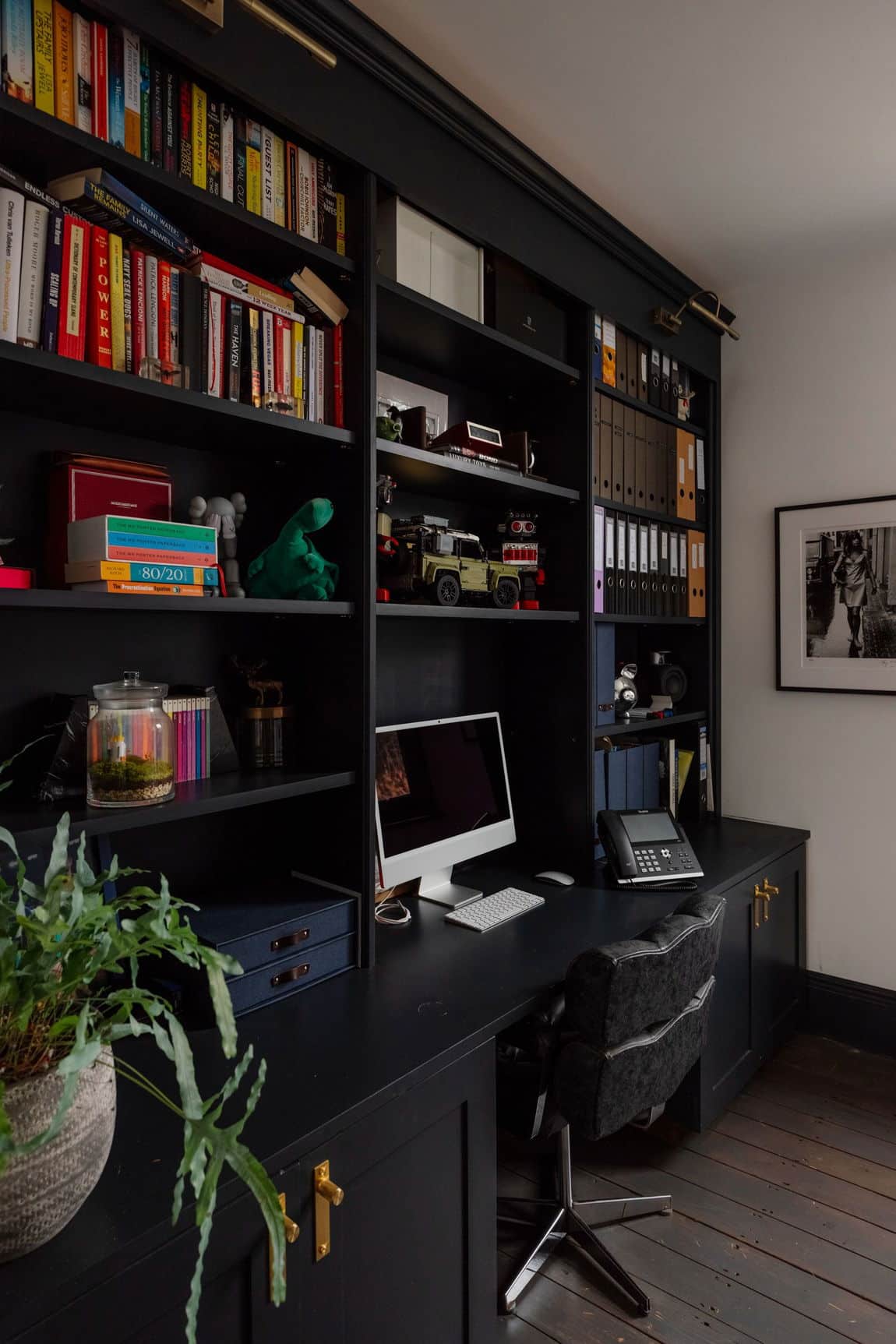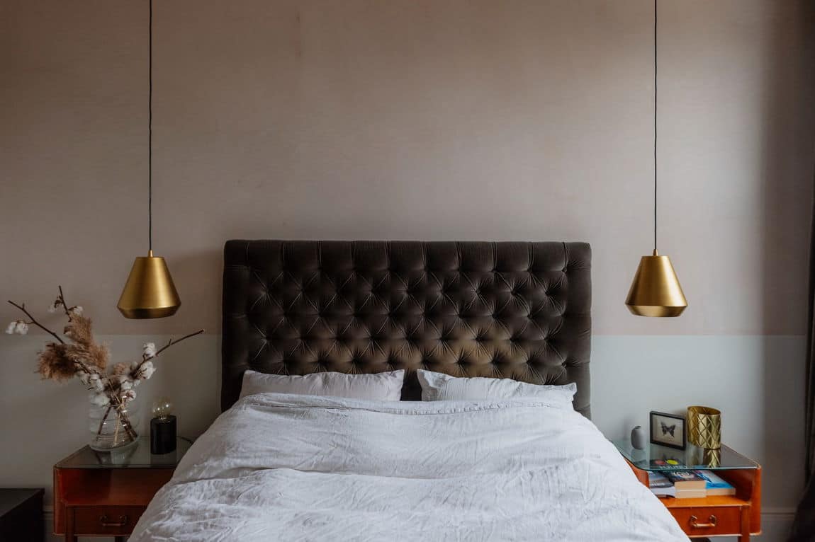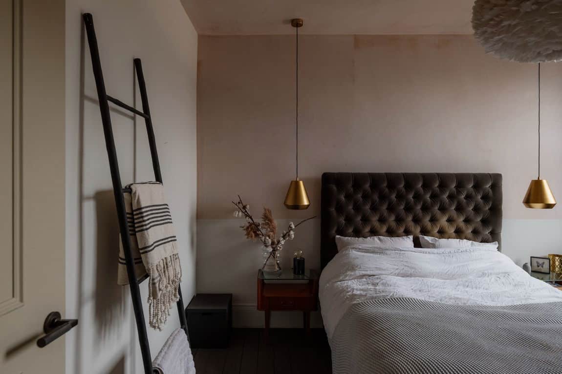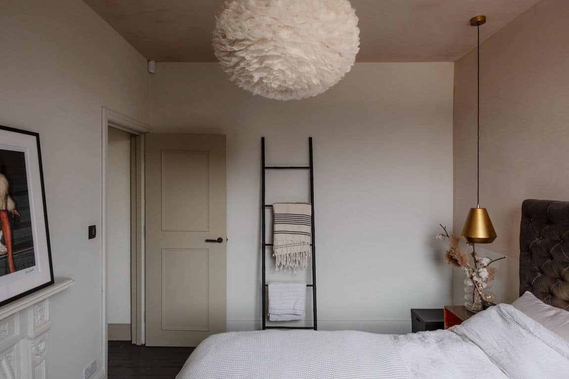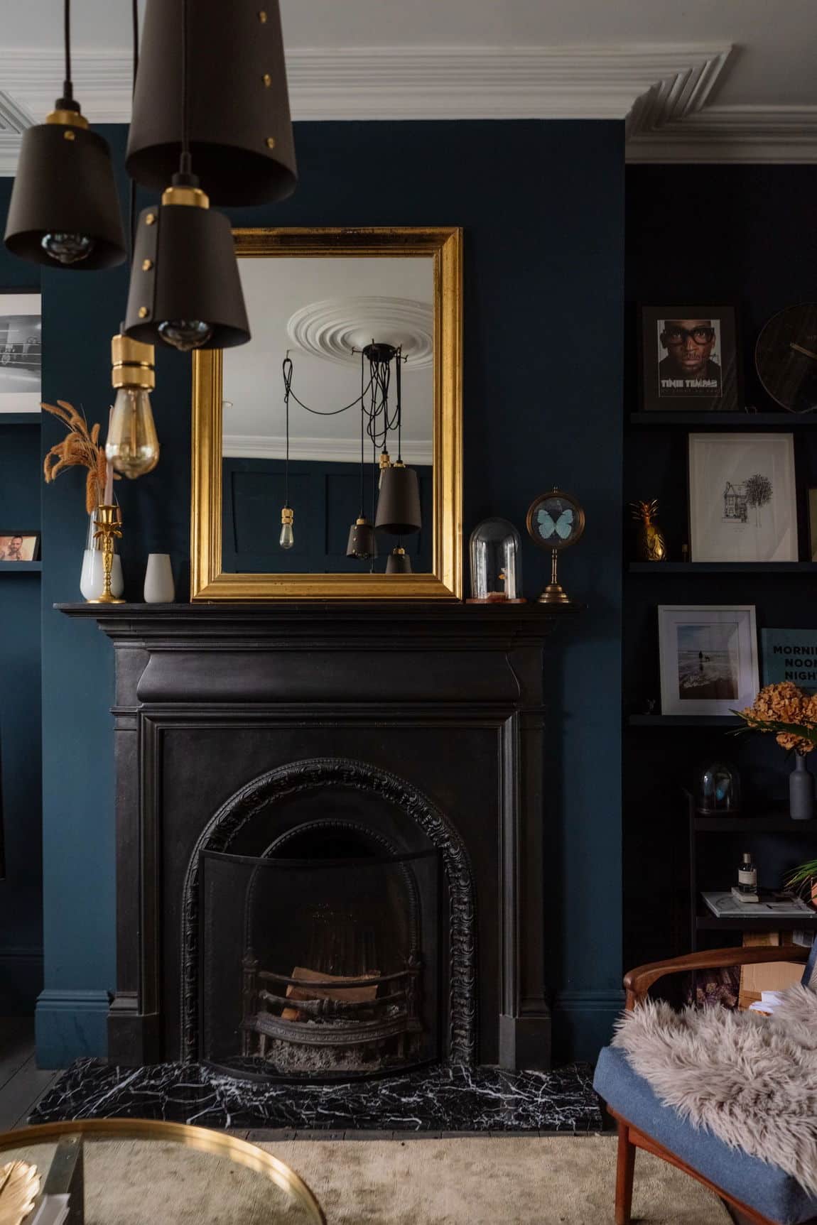 The front reception is rich and atmospheric, finished with reworked original style cornicing, an iron cast fireplace, timber flooring and Victorian style radiators. A bespoke Crittall style fluted glass door replaces the dividing wall, allowing light to flow through while retaining a sense of separation.