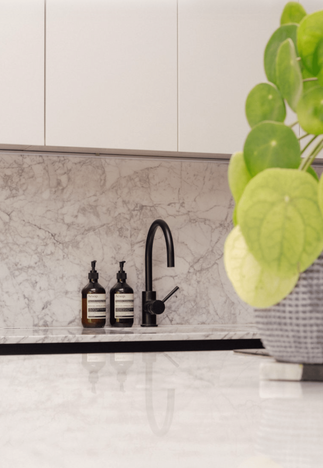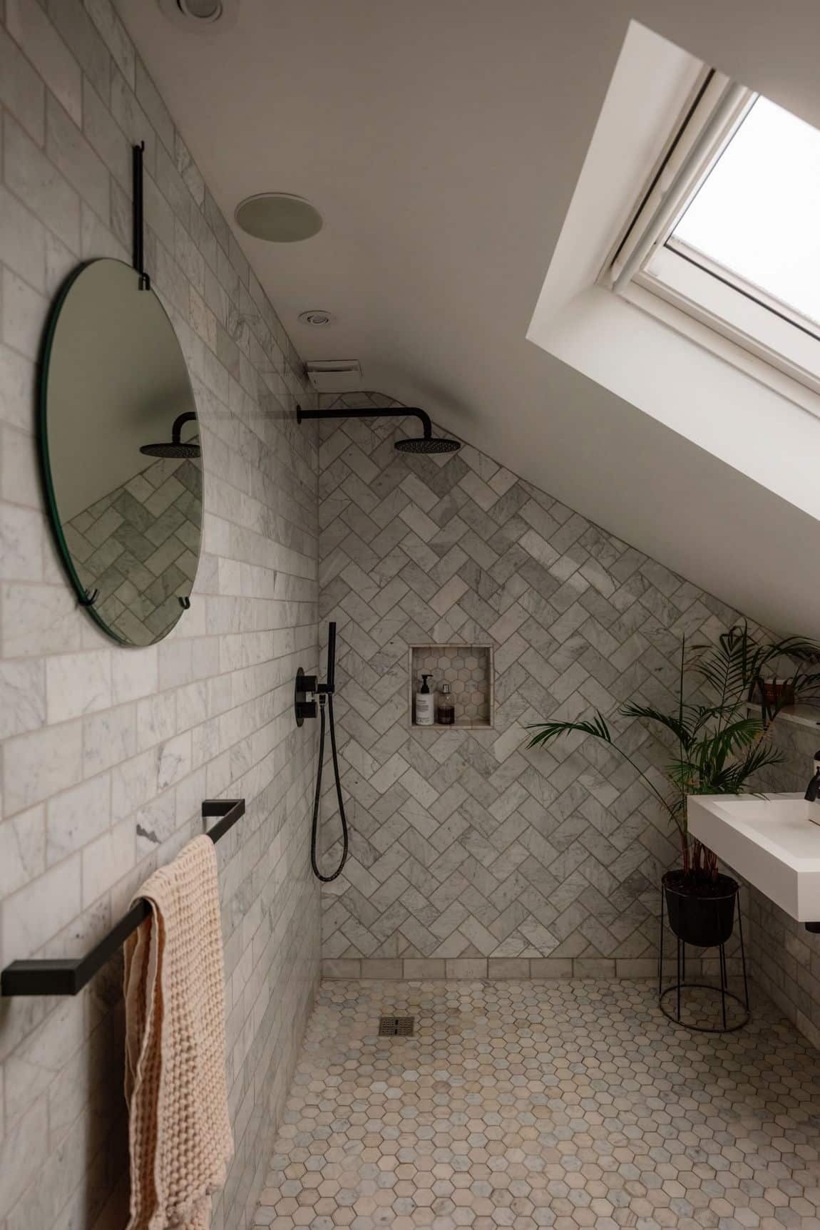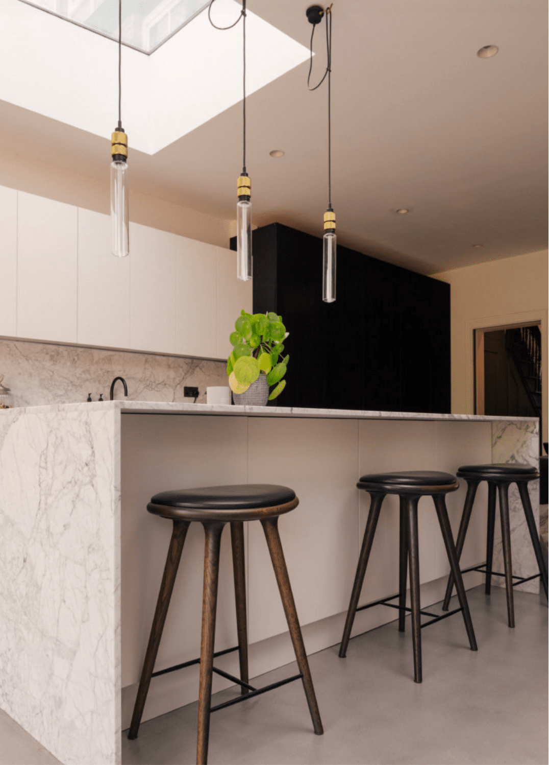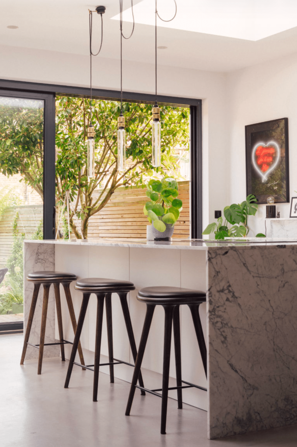 • Polished concrete floors, marble worktops, skylights and sliding glass doors.