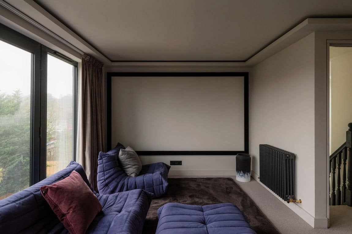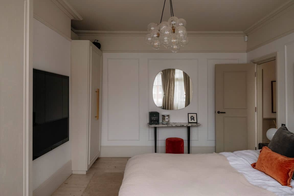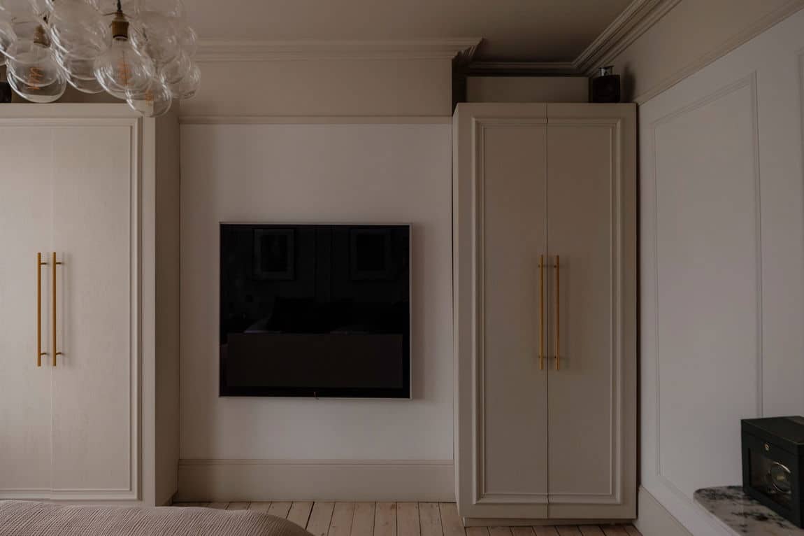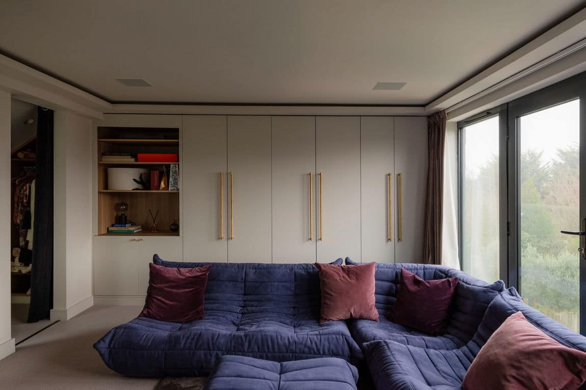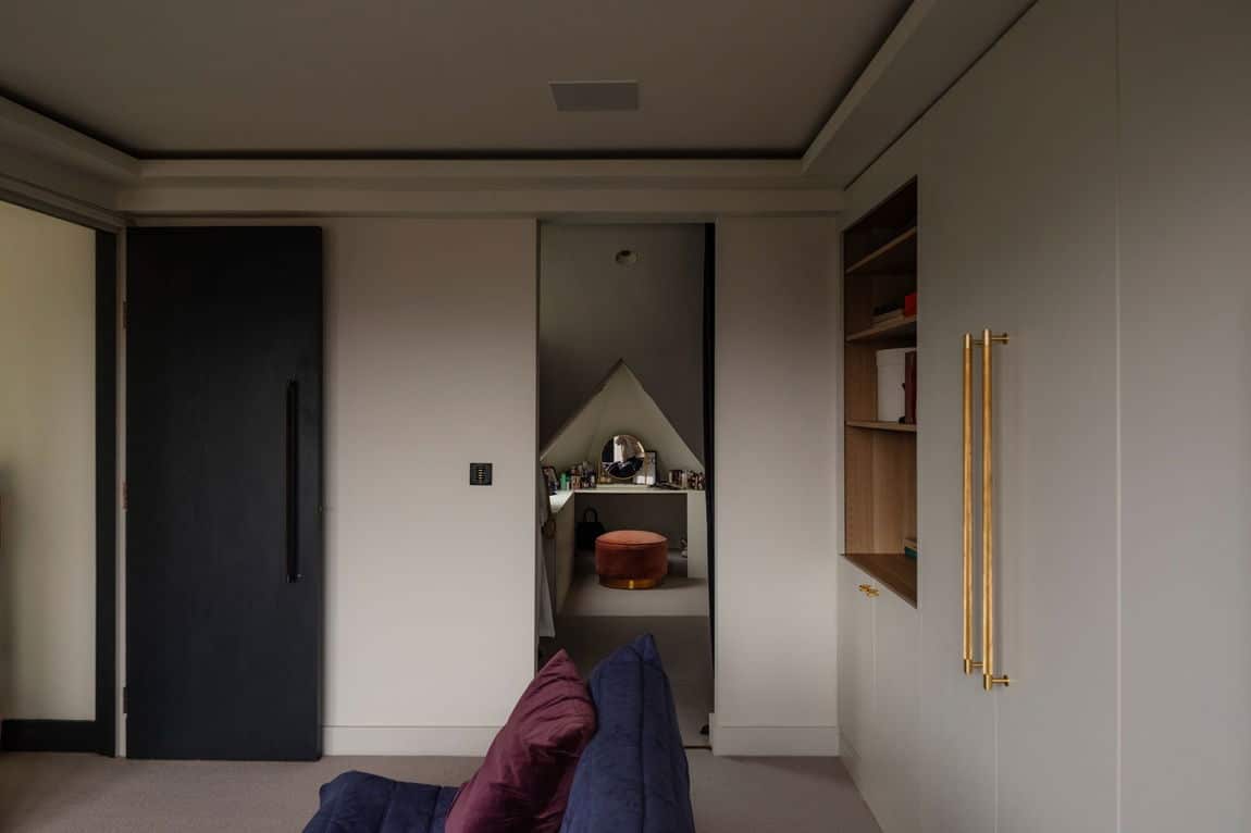 The loft has been converted into an impressive principal suite, flooded with light via floor to ceiling glass doors. Bespoke joinery, a large ensuite bathroom and excellent use of the eaves create a flexible dressing area, snug or retreat depending on preference. Air conditioning has been installed in several rooms, ensuring comfort year round.