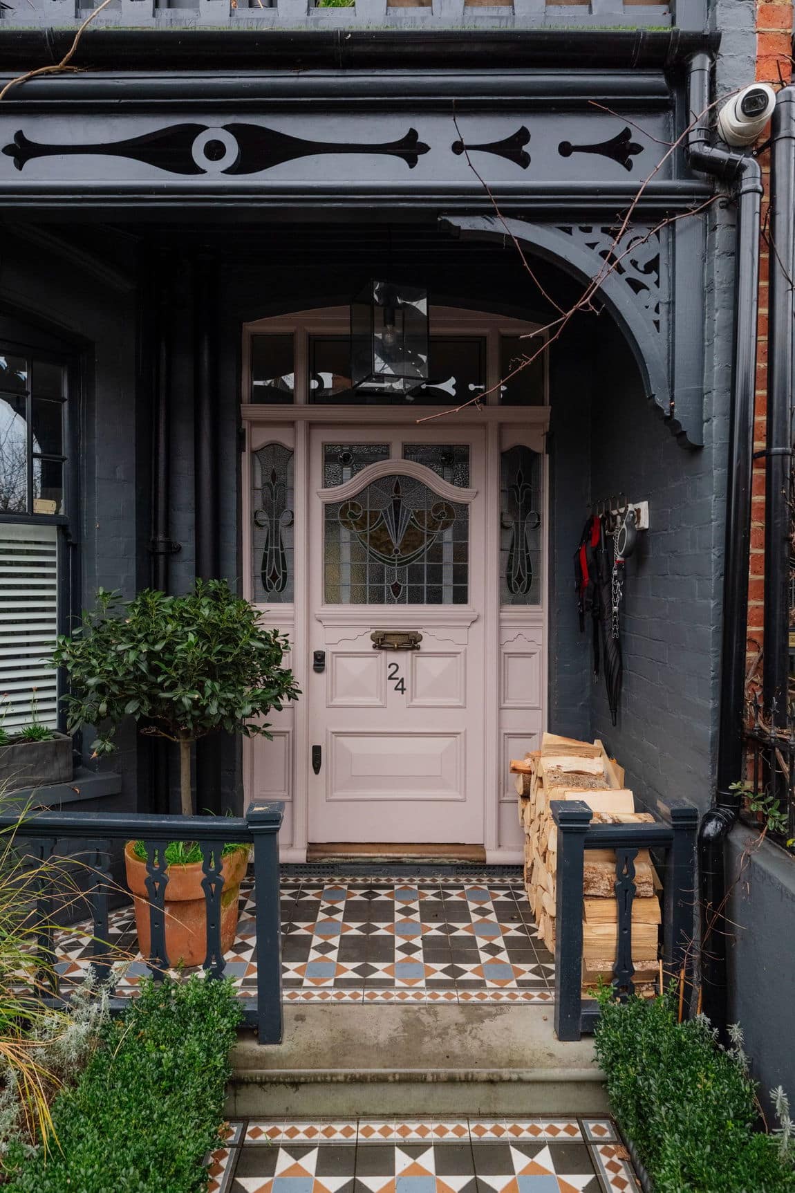 The approach immediately stands out. Ornate timber detailing frames the porch, while the dark, moody façade gives a subtle Gothic edge without ever overpowering the home’s elegance. An original front door with stained glass opens into a striking entrance hall laid with classic red tessellated tiles, setting the tone for what follows.