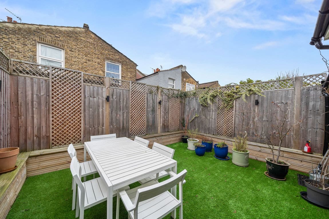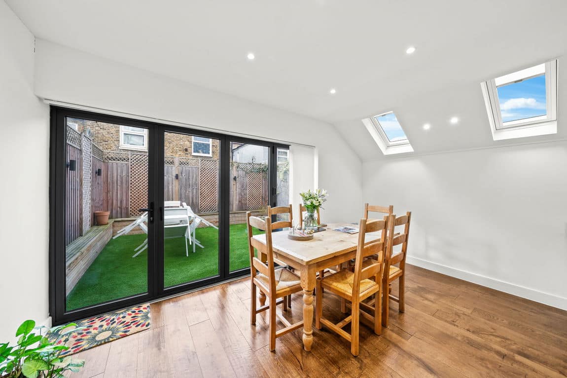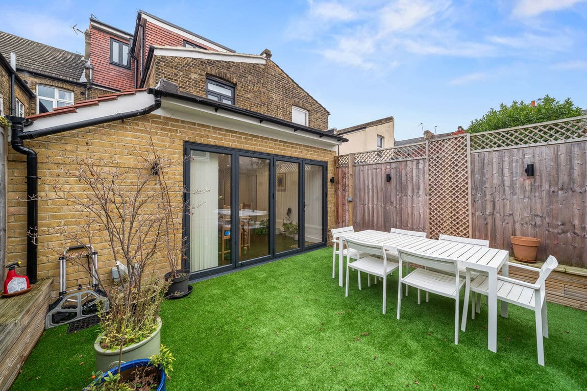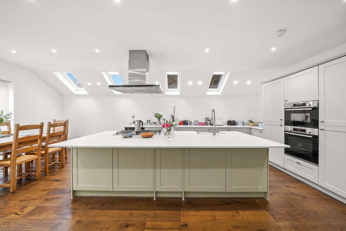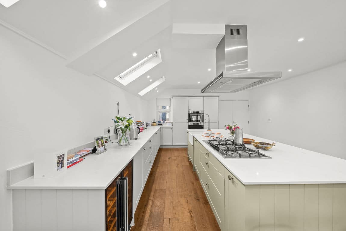 At the rear, the house broadens into a standout open plan kitchen and dining area, almost five metres across and extending over seven metres. The contemporary kitchen is finished with solid worktops and clean modern cabinetry, creating a purposeful and inviting environment. Bi fold doors draw you out to the west facing garden, arranged for practical living with space to dine, relax and enjoy low maintenance outdoor time.